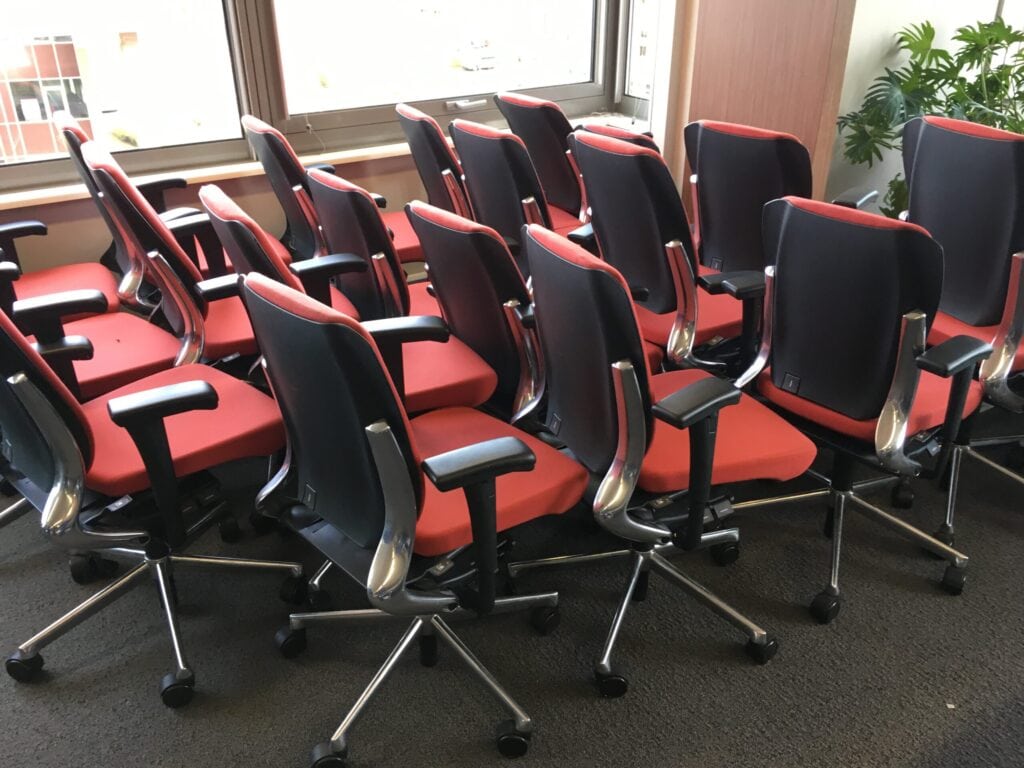 Nette bureaustoelen, in hoogte, breedte en gewicht verstelbaar. Totaal 20 stuks. Merk Ahrend