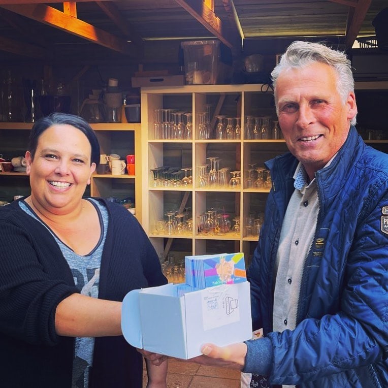 Jaap Geurtsen van Agrio uitgeverij ‘s-Heerenberg heeft Stefanie van Stichting Re-free in ‘s-Heerenberg een glimlach én 1000 visitekaartjes bezorgd Re-Free ondersteunt kwetsbare gezinnen en individuen met levensmiddelen, huisraad, kleding, speelgoed etc. Jaap kwam