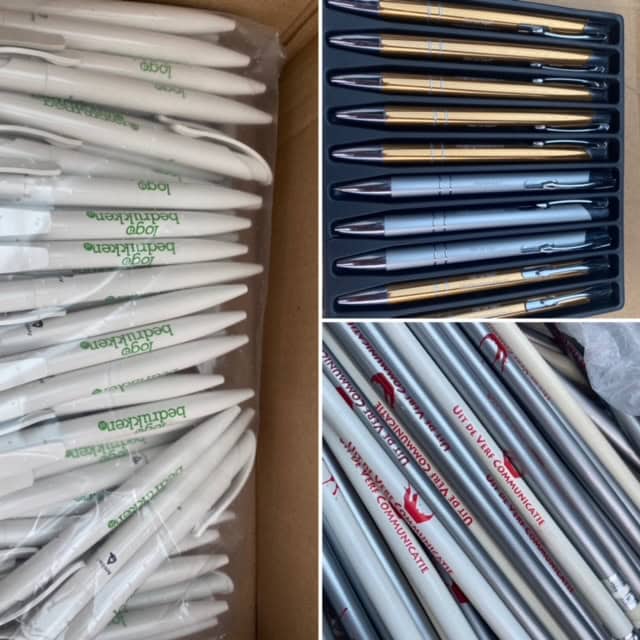 Groot aantal pennen en potloden, aangeboden door Uit de Verf Communicatie en Logobedrukken.nl Tijdens Beursvloer de Liemers gematcht met diverse aanwezige deelnemers 2023-03-27 13:35:13
